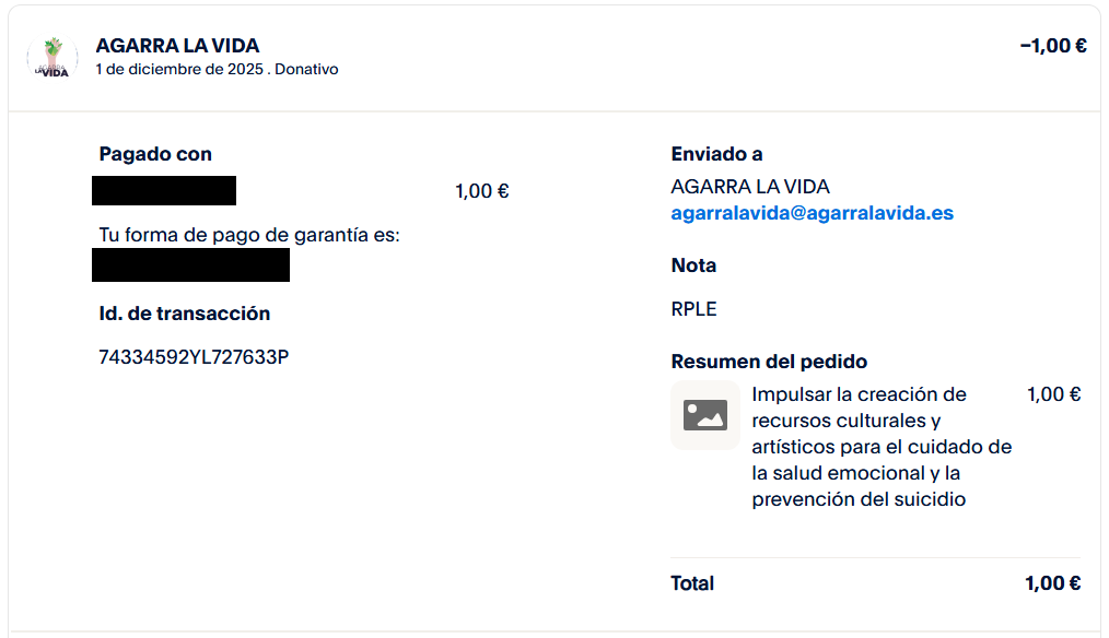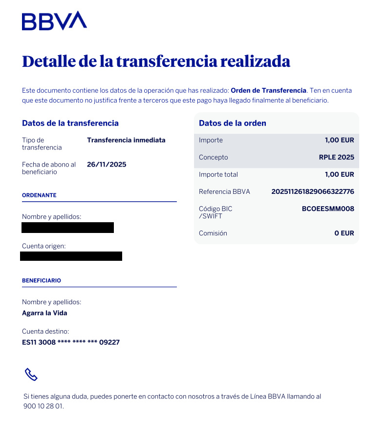 Si lo prefieres, también puedes donar por PayPal con este enlace. Recuerda enviarnos también el justificante de la donación a nuestro correo electrónico como en este ejemplo